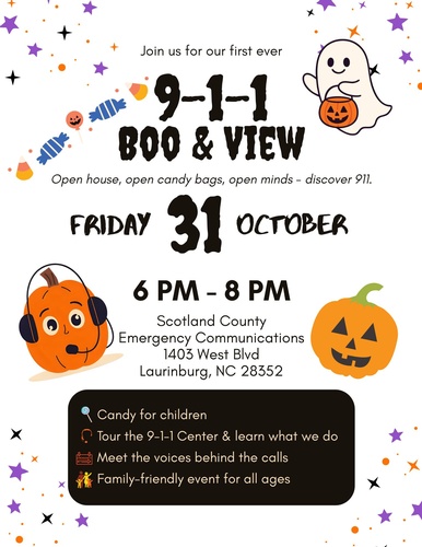 Name: 911 Boo & ViewDate: October 31, 2025Time: 6:00 PM - 8:00 PM EDT911 Boo & ViewEvent Description:911 boo & View open house for the Scotland County Emergency Communications Center- Candy for children.